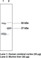 PPARδ is one of three peroxisome proliferator-activated receptor (PPAR) subtypes that possess a domain structure common to other members of the nuclear receptor gene family. It was first cloned from Xenopus laevis and named PPARβ.1 PPARδ is ubiquitously expressed but is particularly abundant in tissues such as liver, intestine, kidney, abdominal adipose, and skeletal muscle, all of which are involved in lipid metabolism.2 PPARδ is a mediator of diverse physiological functions including lipid and cholesterol homeostasis, embryo implantation, and cancer development.3,4,5,6 Most recently, attention has been focused on the role of PPARδ in obesity.7 Cayman’s PPARδ polyclonal antibody can be used for western blot, immunohistochemistry, and immunocytochemistry to study the expression and functions of this protein. The antibody recognizes PPARδ at 50 kDa from human samples. An additional smaller size of PPARδ (~ 40 kDa)8 is also detected in certain mouse tissues.